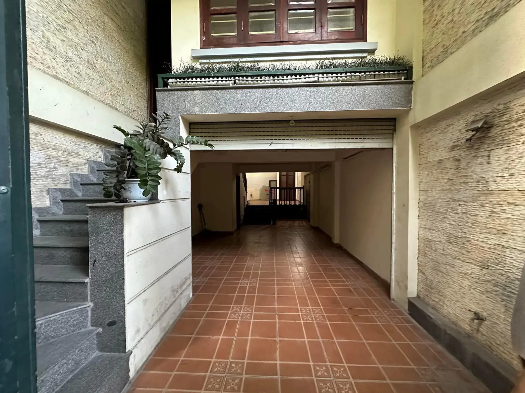 Hiện trạng nhà mới thiết kế hiện đại tầng lửng hầm để 2 ô tô và 10 xe máy.